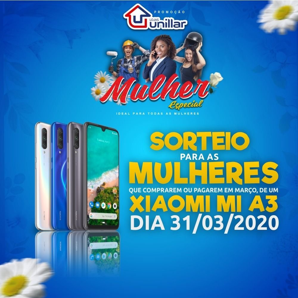 A Unillar é ideal para todas as mulheres, por isso, além de participar do sorteio de 2 carros por ano, as mulheres que comprarem e pagarem no mês de março iram concorrer no dia 31 a um celular Xiaomi Mi A3.