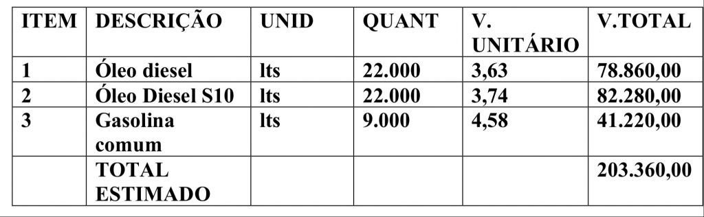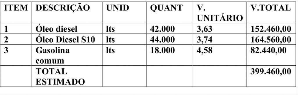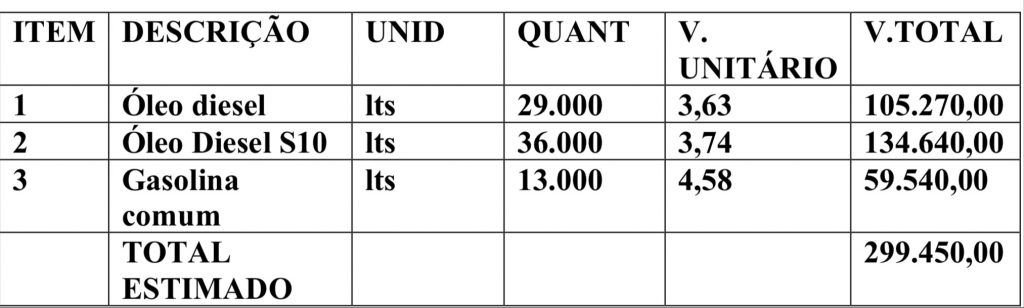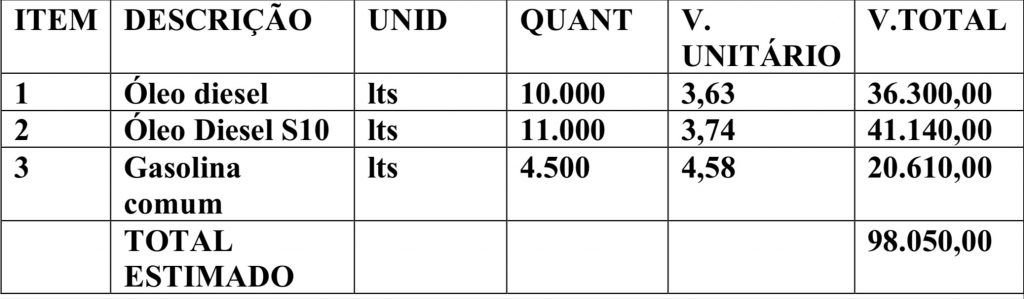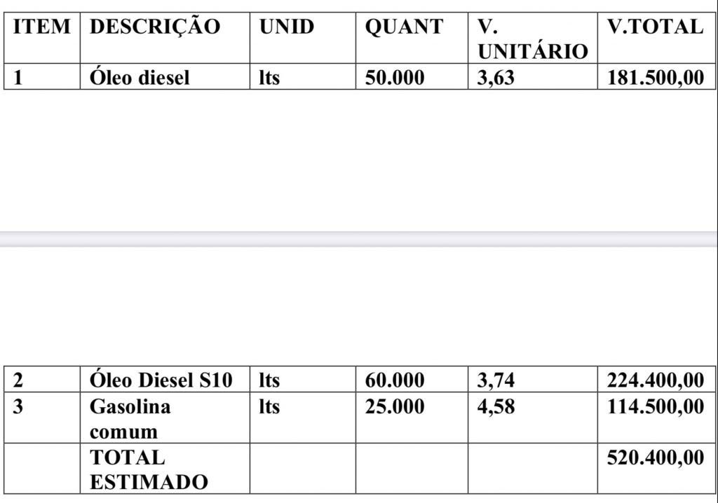 A Administração celebrou contratos com a empresa para compra de quase meio milhão de litros de combustíveis entre óleo diesel, óleo diesel S10 e gasolina comum, conforme contratos: