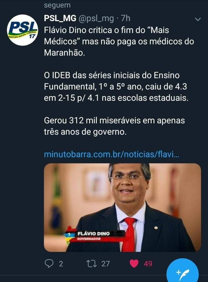 O PSL de Minas Gerais, segundo maior colégio eleitoral do Brasil, destacou em sua página no Twitter, uma matéria do Blog Minuto Barra a respeito do fim do programa “Mais Médicos”, onde diz que o governador do Maranhão Flávio Dino critica o fim do programa por parte do futuro governo Bolsonaro, mas não paga os médicos do estado que estão sem receber salário desde agosto.