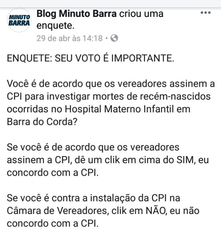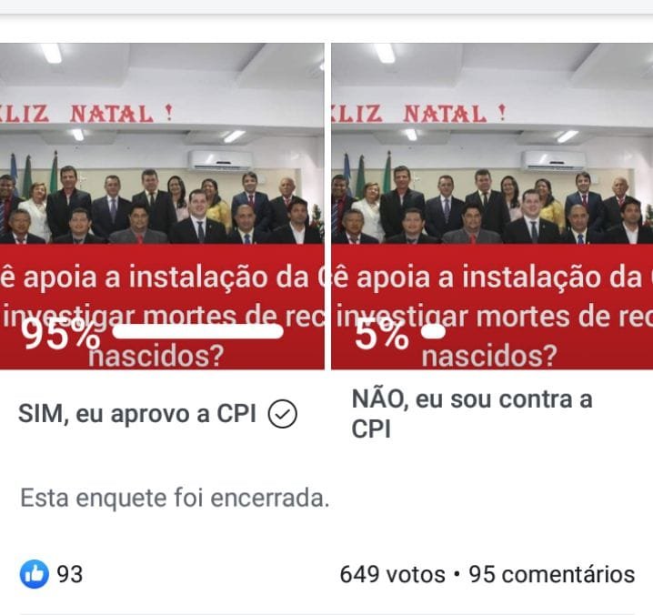 Para 95% dos que votaram na enquete, querem a CPI na Câmara Municipal de Barra do Corda, enquanto 5% disseram não querer a CPI para investigar tais mortes.